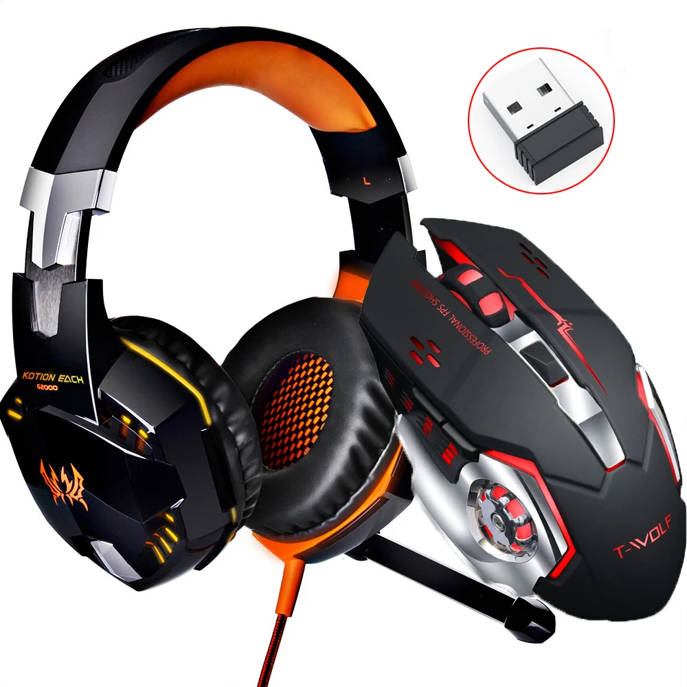KOTION каждый G2000 глубокий бас игровой гарнитуры проводные наушники с микрофоном стерео + 2.4GH 6D оптический 2400 Точек на дюйм Беспроводной PC Gaming Мышь